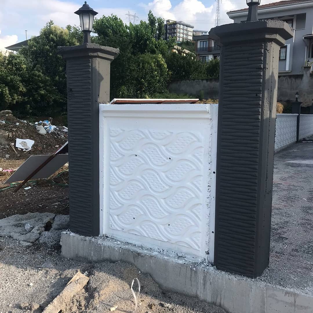 Çelik kalıp kullanılarak farklı yüzey desenli, istenen aralıkta kolonlu, harpuştalı olarak temel hatılı ile birlikte demir donatılı beton duvar yapılmaktadır.