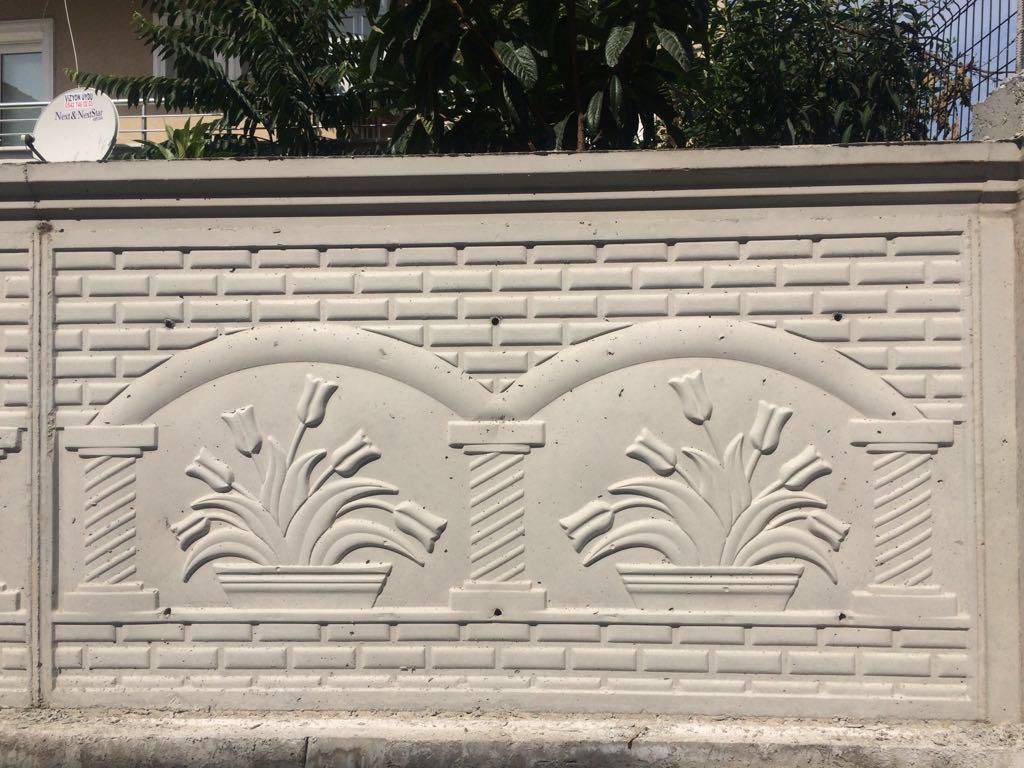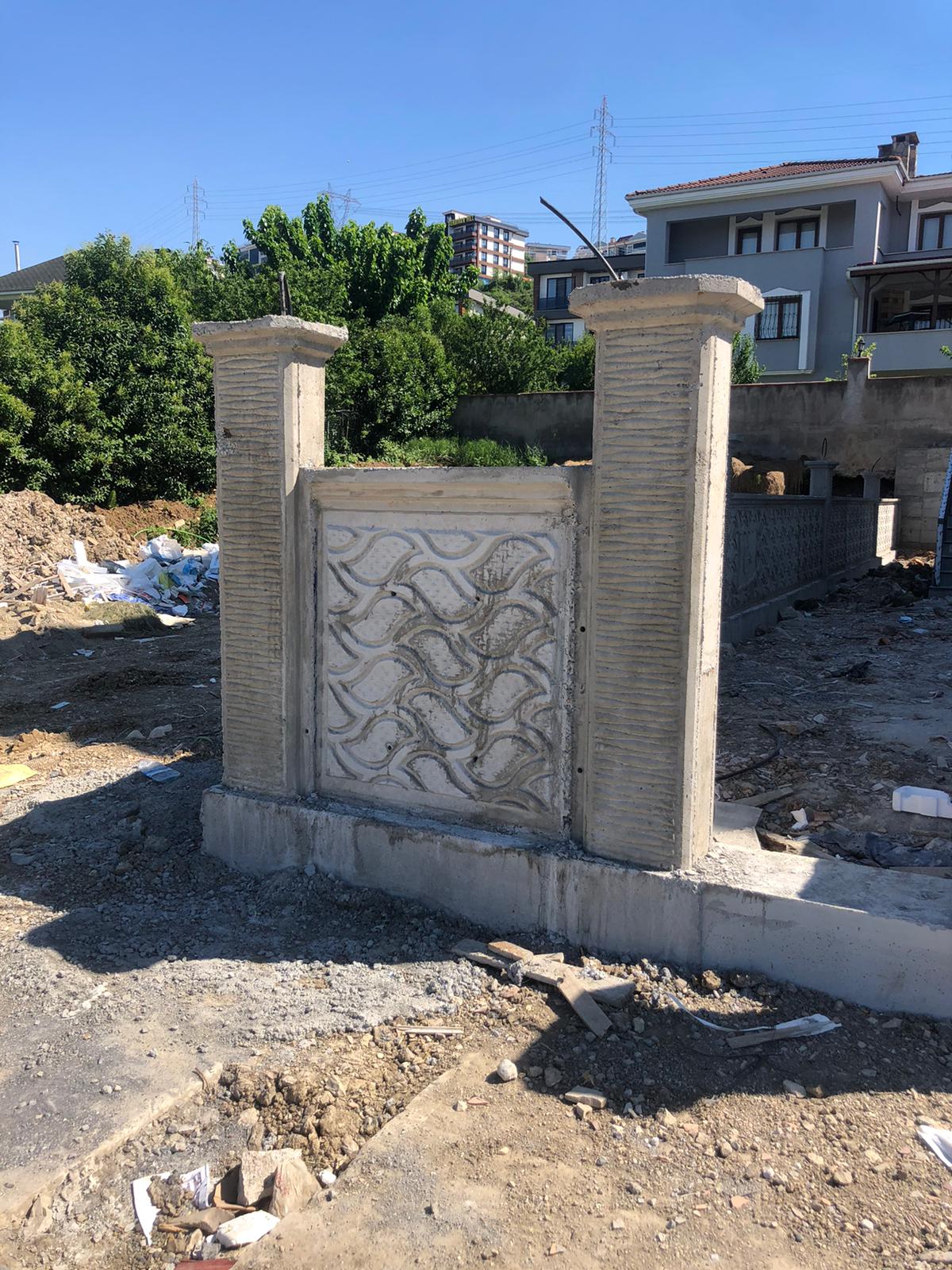 Çelik kalıp kullanılarak farklı yüzey desenli, istenen aralıkta kolonlu, harpuştalı olarak temel hatılı ile birlikte demir donatılı beton duvar yapılmaktadır.